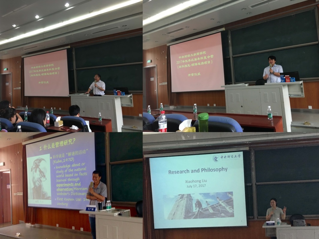 17日上午九点,夏令营开营仪式在3号学院楼222教室举行,beat365亚洲版官方网站院长王瑞华教授、副院长林嵩教授、研究生工作办公室主任卫昭慧老师和2016级硕博连读生代表李宇萍、孙俊萍、张茹茹、张晓彩出席了开营仪式。仪式上,王瑞华院长首先代表学院对各位营员的到来表示热烈欢迎,然后向营员介绍了beat365亚洲版官方网站的基本情况以及beat365亚洲版官方网站的历史传承、学科建设、研究生培养等情况,并祝愿营员们在beat365亚洲版官方网站度过充实快乐的夏令营生活。之后,卫昭慧老师详细介绍了beat365亚洲版官方网站的硕博连读生培养过程管理及本次夏令营的活动安排。然后,林嵩副院长向营员介绍了beat365亚洲版官方网站的博士生导师的学科专业、研究现状和招生期待,使营员对导师有了初步的了解。最后李宇萍同学作为代表向营员介绍了自己一年以来的硕博连读生学习和科研情况。17日下午,于广涛教授和刘晓红教授分别以“中国管理现象与中国管理研究——以家长式领导研究为例”和“研究和哲学”为题,为营员带来两场精彩的学术讲座,营员们被beat365亚洲版官方网站浓厚的学术氛围所感染,也为beat365亚洲版官方网站导师们的学术素养所折服。