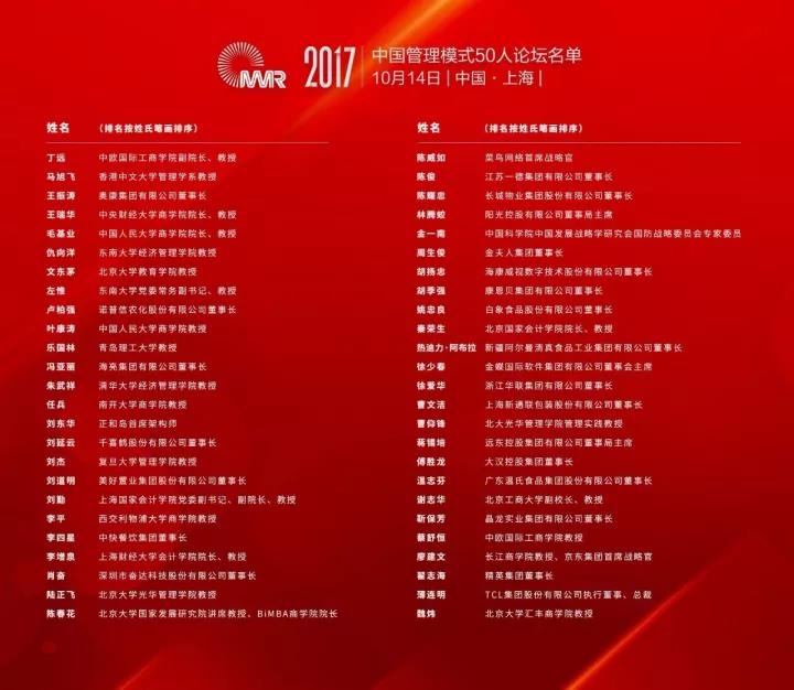 2017年10月14日,由北大国发院教授陈春花等25位管理学者、金蝶集团创始人徐少春等25位企业家共同发起的“中国管理模式50人论坛”在上海举行,论坛由中国管理模式杰出奖升级而来,探讨在文化自信背景之下独特的中国管理价值。beat365官网beat365亚洲版官方网站院长兼MBA教育中心主任王瑞华教授以25位管理学者之一的身份,入选“中国管理模式50人论坛” (简称C50论坛),并参加了论坛的讨论和交流。