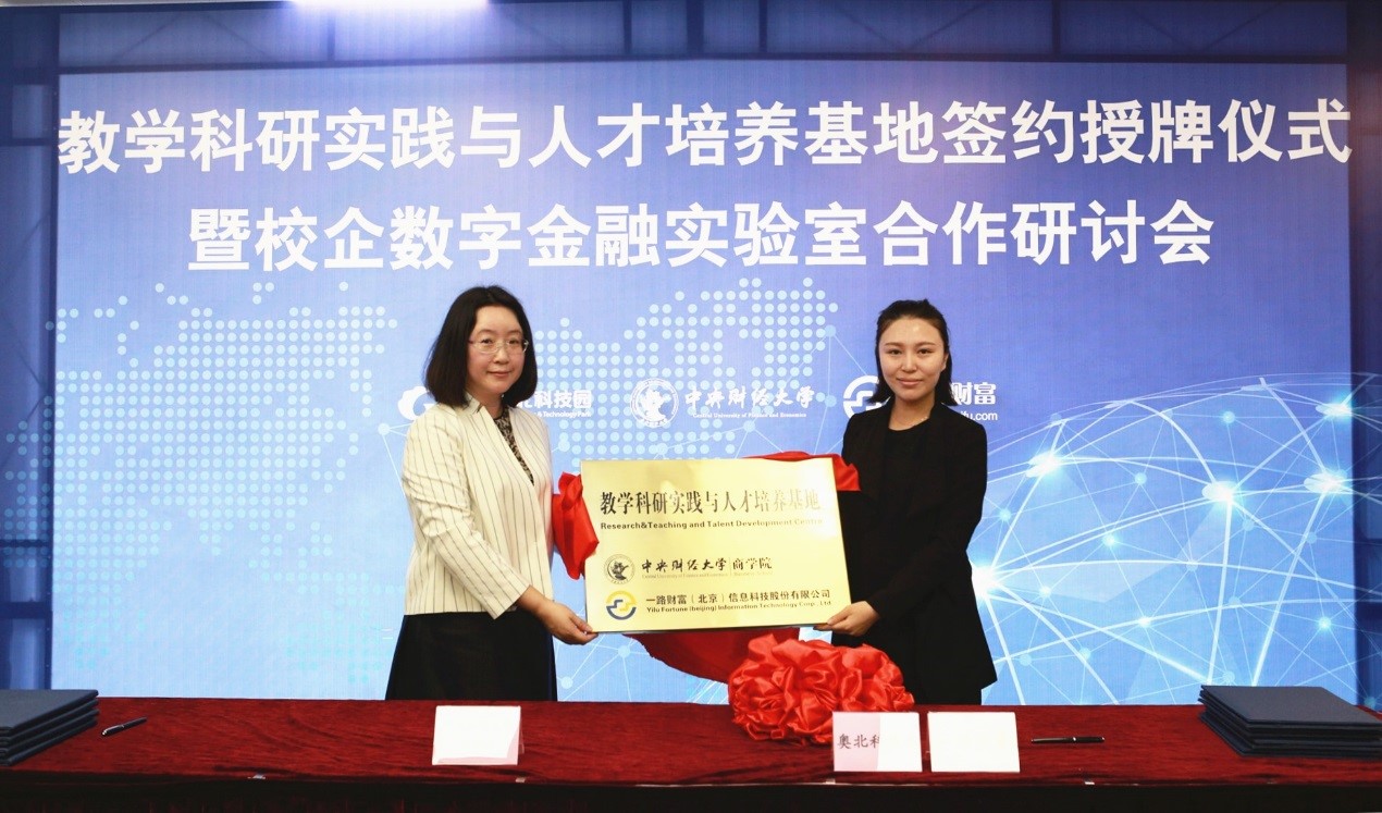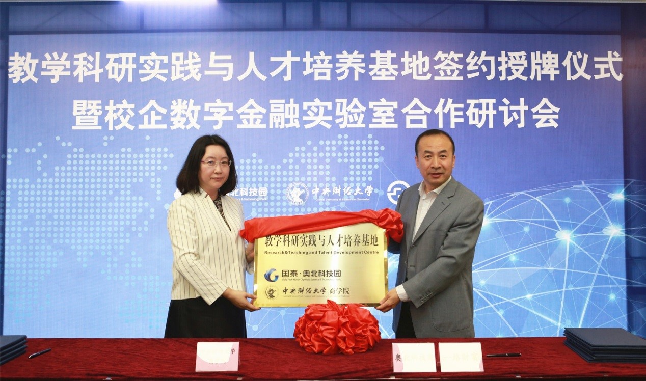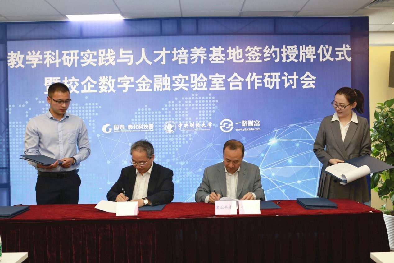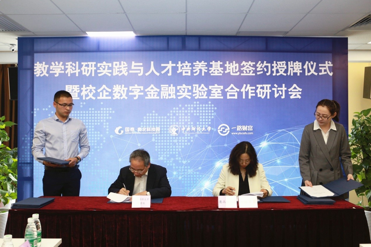 随后,王瑞华院长分别与何泽平董事长、吴雪秀副总裁共同签署了国泰集团、一路财富校企合作协议。葛建新书记代表beat365亚洲版官方网站向国泰集团、一路财富授予beat365亚洲版官方网站教学科研实践与人才培养基地铜牌,并分别与何泽平董事长、张妍总监为教学实践基地揭牌。