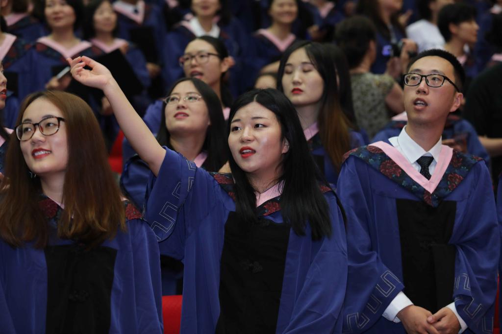 毕业生代表致辞结束后,音乐响起,会场上演了一场精心准备的歌曲快闪活动。伴随着四位毕业生的领唱,在场全体同学合唱歌曲《光阴的故事》,流水带走了光阴的故事,却在中财留下了毕业生们的青春回忆,大家通过这种特别的方式来怀念过去、歌唱未来。