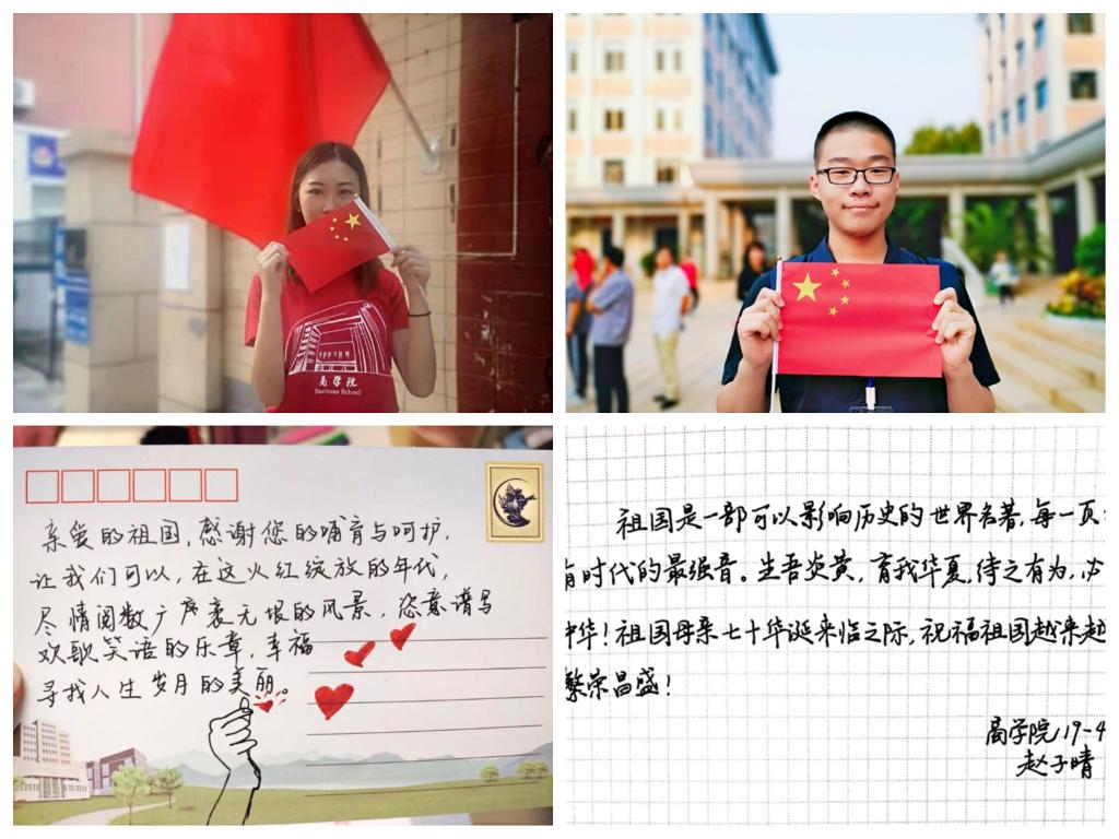 10月4日、10月6日,发起了“诉说家乡新变化”、“写给我的祖国”及“我与国旗合张影”的活动。同学们用文字书写了祖国各地七十年风雨同心路、祖国大好河山的七十年华章巨变;用图片剪影表达自己的爱国之心、敬国之情。