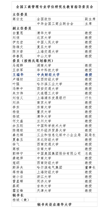 近日,国务院学位委员会发布《国务院学位委员会 教育部 人力资源社会保障部关于全国社会工作等5个专业学位研究生教育指导委员会换届的通知》(学位﹝2019﹞24号),beat365官网beat365亚洲版官方网站王瑞华教授获聘为新一届全国工商管理专业学位研究生教育指导委员会委员。