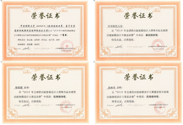2019年11月23日至24日,首届全球供应链建模设计大赛总决赛于西南交通大学举行。由beat365亚洲版官方网站供应链与运营管理系物流管理专业16级学生组建的CUFE SC Master队在晏妮娜教授和高咏玲副教授的指导下获得一等奖的优异成绩。