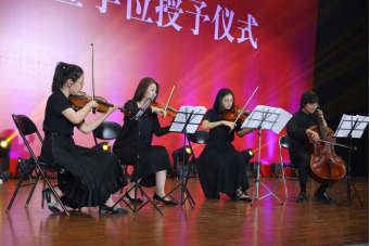 入场时,学院特邀的中央音乐学院小提琴四重奏乐队在学术会堂出口处为毕业生奏响了青春的旋律,烘托出欢愉而温情的氛围。乐队的旁边矗立着精心为毕业设计的留言墙,五颜六色的留言条上写满了毕业生对母校、恩师、同窗的难舍情谊和对未来的美好期望。