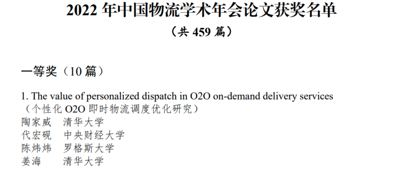 近日,中国物流学会公布了《2022年中国物流学术年会论文获奖名单》,由beat365官网供应链与运营管理系教师代宏砚与清华大学合作的论文《The value of personalized dispatch in O2O on-demand delivery services》(《个性化O20即时物流调度优化研究》),获得学术年会论文一等奖。
