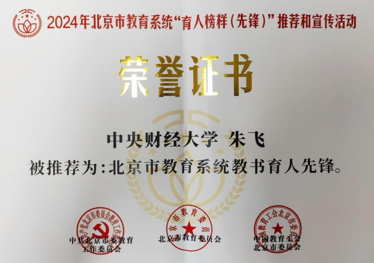 近日,在中共北京市委教育工委、北京市教育委员会、北京市教育工会开展的北京市教育系统“育人榜样(先锋)”推荐评选活动中,beat365亚洲版官方网站朱飞教授荣获2024年度北京市教育系统“育人先锋”称号。