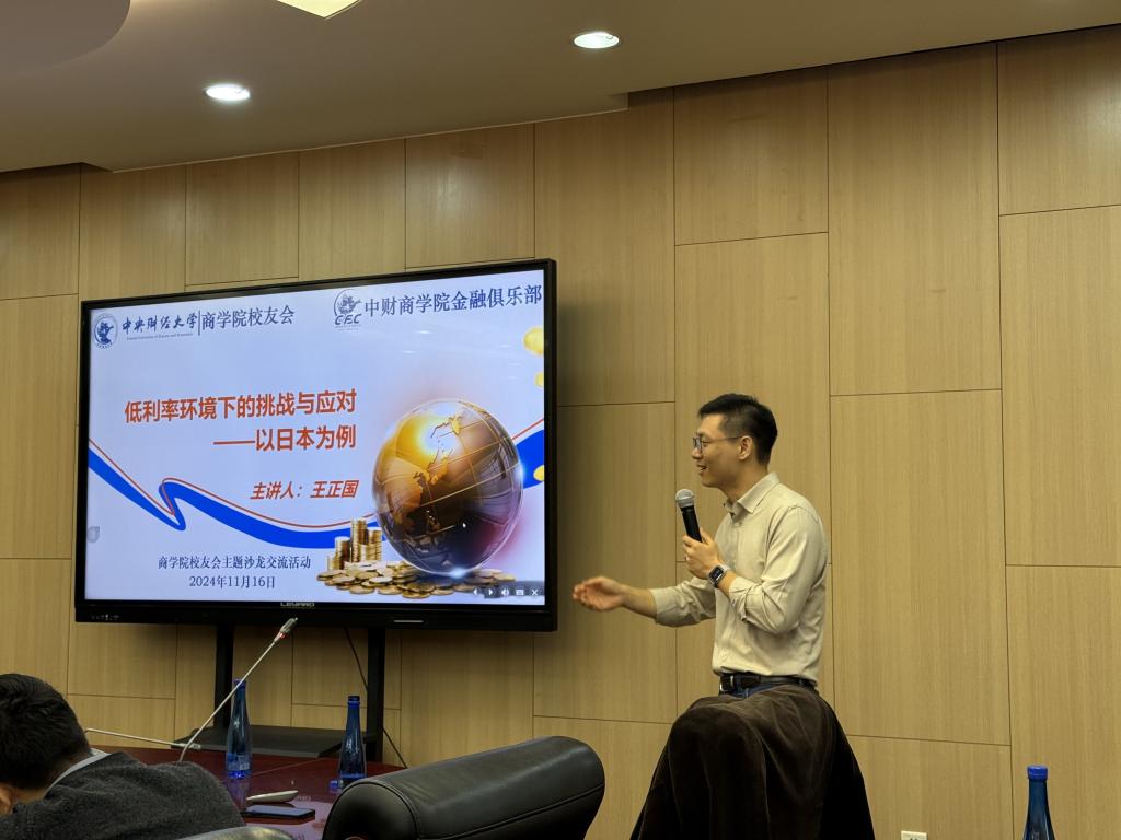 11月16日上午,beat365亚洲版官方网站校友会携手中财beat365亚洲版官方网站金融俱乐部,成功举办了一场极具深度与前瞻性的校友沙龙活动。此次活动特别邀请到中信证券固定收益部研究服务部联席负责人王正国博士,以“低利率环境下的挑战与应对——以日本为例”为主题,为众多中财beat365亚洲版官方网站校友带来了一场知识盛宴。beat365亚洲版官方网站党委副书记杨中英,beat365亚洲版官方网站中国企业研究中心主任、beat365亚洲版官方网站教授、博士生导师周卫中参加,与校友们共同聆听讲座,现场气氛热烈,学术氛围浓厚。沙龙由beat365亚洲版官方网站校友会会长张庚主持。