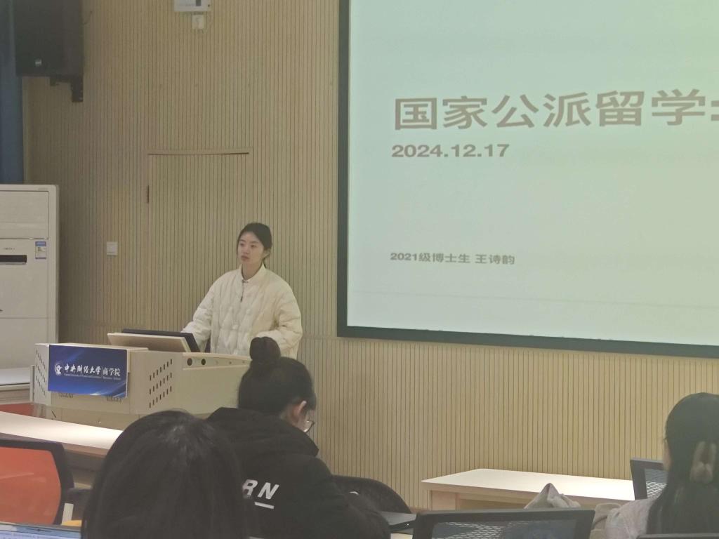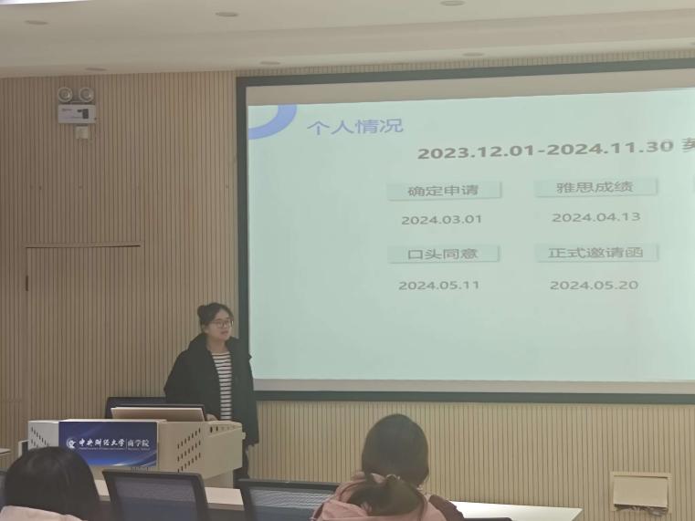 随后,2021级博士生王诗韵同学就国家公派留学的资料准备与经验进行了分享。她详细介绍了国家留学网的相关信息,包括选派指南、时间安排、计划选派人数等,并逐步讲解了申请流程,涵盖注册、填写申请信息、上传附件材料等具体操作。她特别强调了外语水平要求及研修计划的撰写要点,为有意申请公派留学的同学提供了清晰的指导。
