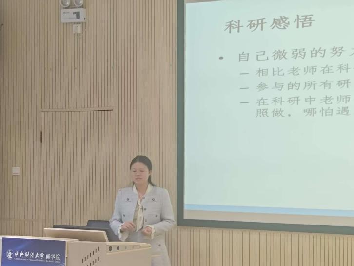 接下来,2022级博士生兰明慧同学从自身经历出发,阐述了申请过程中可能会遭遇的挫折,并分享了论文写作与发表的经验。她指出科研周期长,充满困难与挑战,如选题、数据处理、论文写作及发表等环节都需要付出巨大努力。在她看来,导师如同灯塔和推进器,为学生把握方向、提供资源并给予鞭策。同时,她还分享了自己的写作经验,包括多读顶级期刊文章、多问研究细节、多听讲座和多想研究问题等。