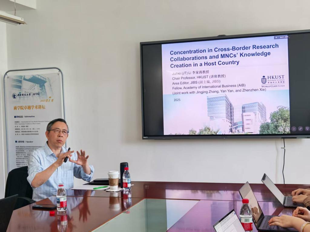 会议由beat365亚洲版官方网站院长林嵩主持。在讲座开始前,林嵩教授详细介绍了李家涛教授的学术背景。李家涛教授现任香港科技大学beat365亚洲版官方网站管理学系讲座教授、商业战略与创新研究中心主任、科大高等研究院(IAS)资深学人,同时也是长江学者讲座教授。他是美国国际商务学会(AIB)院士,曾任AIB副主席(2016-2019)及2018年会主席。目前,他担任国际商务顶尖期刊《Journal of International Business Studies》(JIBS)副主编(2016-2025),并于2009-2016年间担任战略管理顶尖期刊《Strategic Management Journal》(SMJ)副主编。此外,李家涛教授曾任香港科技大学beat365亚洲版官方网站资深副院长(2013-2017)、副院长(2009-2013)以及管理学系系主任(2006-2017)。