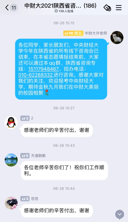由组织与人力资源管理系严力群老师、教学科研管理办公室主任王月英老师、办公室主任孙翔老师组成的招生热线接听小组于6月21日至30日专门负责接听陕西、甘肃两省的咨询热线和beat365亚洲版官方网站招生咨询热线,耐心解答考生及家长的问题和困惑,在做好招生咨询服务的同时积极展现中财大老师认真负责的风采。