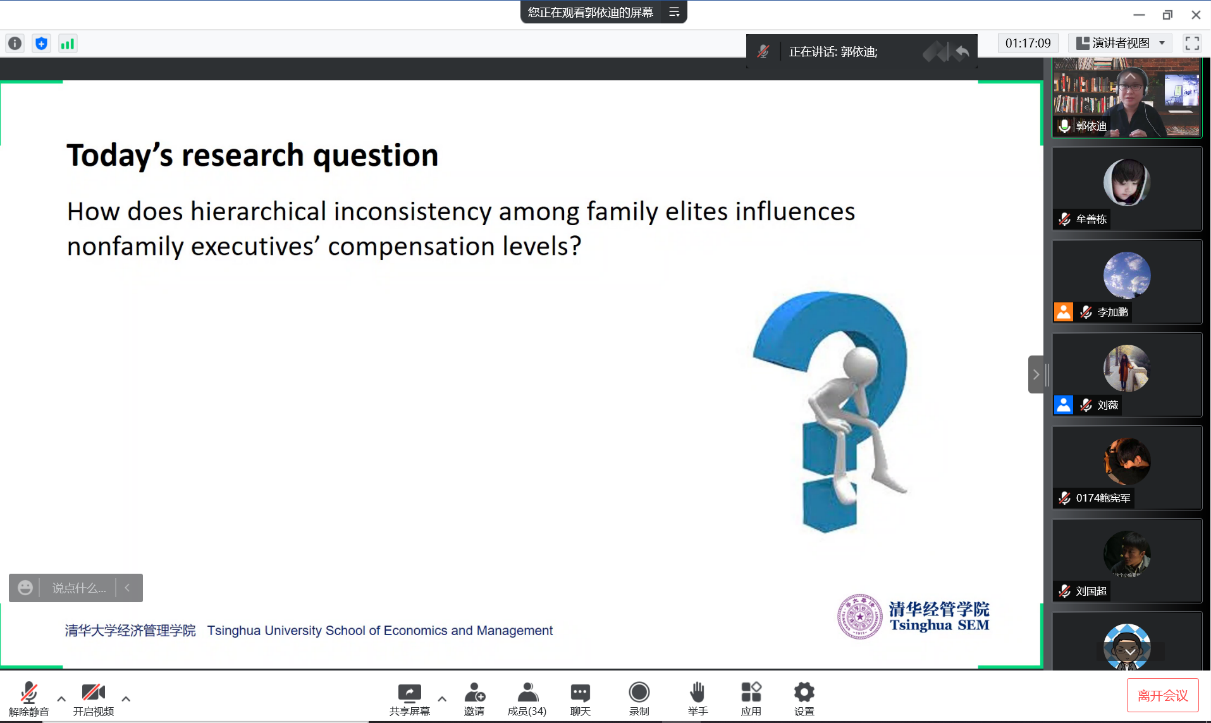 beat365亚洲版官方网站战略系李加鹏博士主持本次会议,并介绍了郭依迪博士的履历。郭依迪现任清华大学经济管理学院创新创业与战略系助理教授,她于2017年在欧洲工商管理学院获得战略学博士学位。郭老师给本、硕、博学生开设《管理学》、《战略管理》、《管理研究方法》等课程,她的研究成果发表在Organization Science,Strategic Management Journal等期刊。