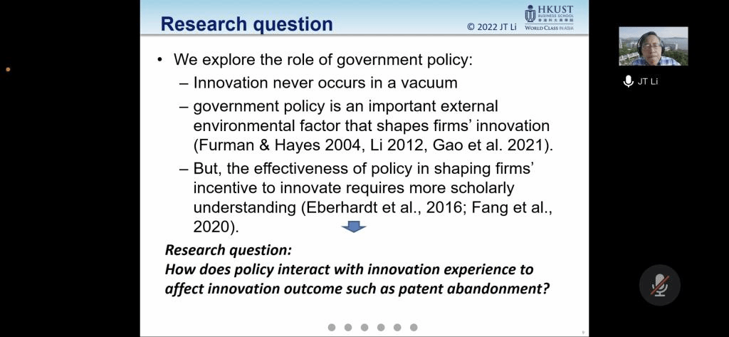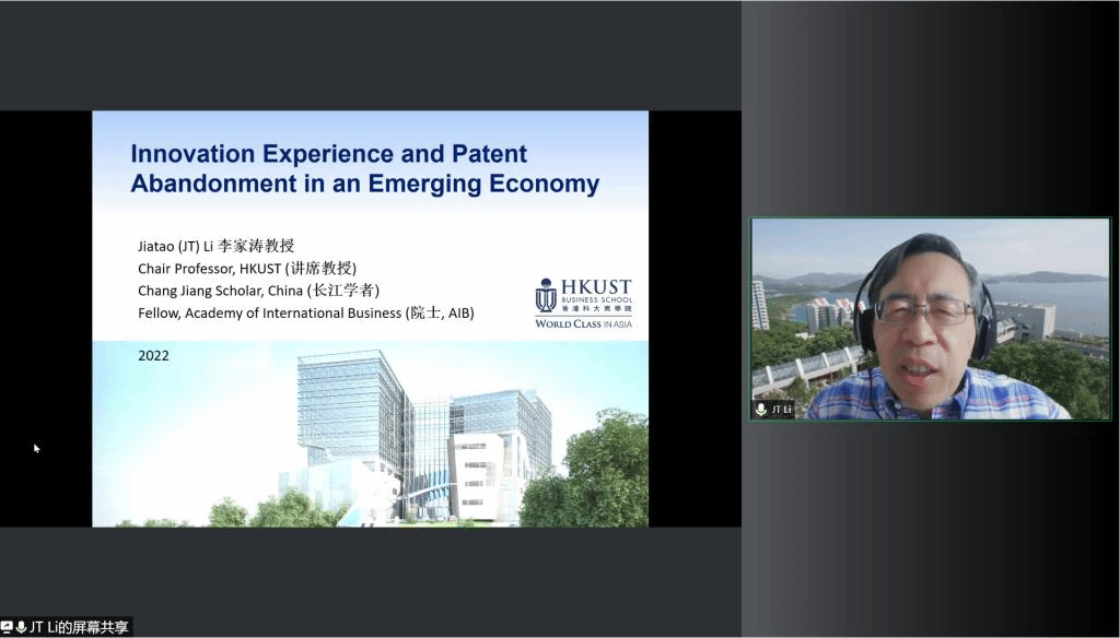 李家涛教授本次主讲的题目为“Innovation experience and patent abandonment in an emerging economy”。文章基于1999年至2010年间中国上市公司专利放弃的数据,探究了“政府政策如何与企业创新经验相互作用以影响其专利放弃等创新成果”这一研究议题。研究结果表明,当政府奖励大量专利的申请时,申请质量会受到影响,尤其是那些具有先前创新经验的公司会被激励去申请更多但不一定是更好的专利。