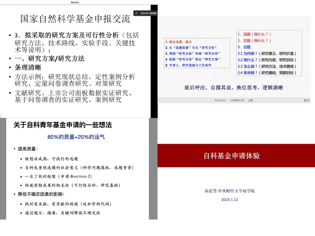 交流会分为两个环节:第一个环节邀请了往年的项目负责人介绍课题申请经验,第二个环节为问题答疑和自由发言。在经验介绍环节,林嵩教授和王震教授从课题申报人和评审人的双重角度讲解了申请课题的技巧和注意事项,顾雷雷副教授和高震男博士通过自身经历介绍了申请课题的想法和体验。经验介绍之后,参会教师就自己在申请课题中遇到的问题进行提问,相关介绍人进行认真解答。