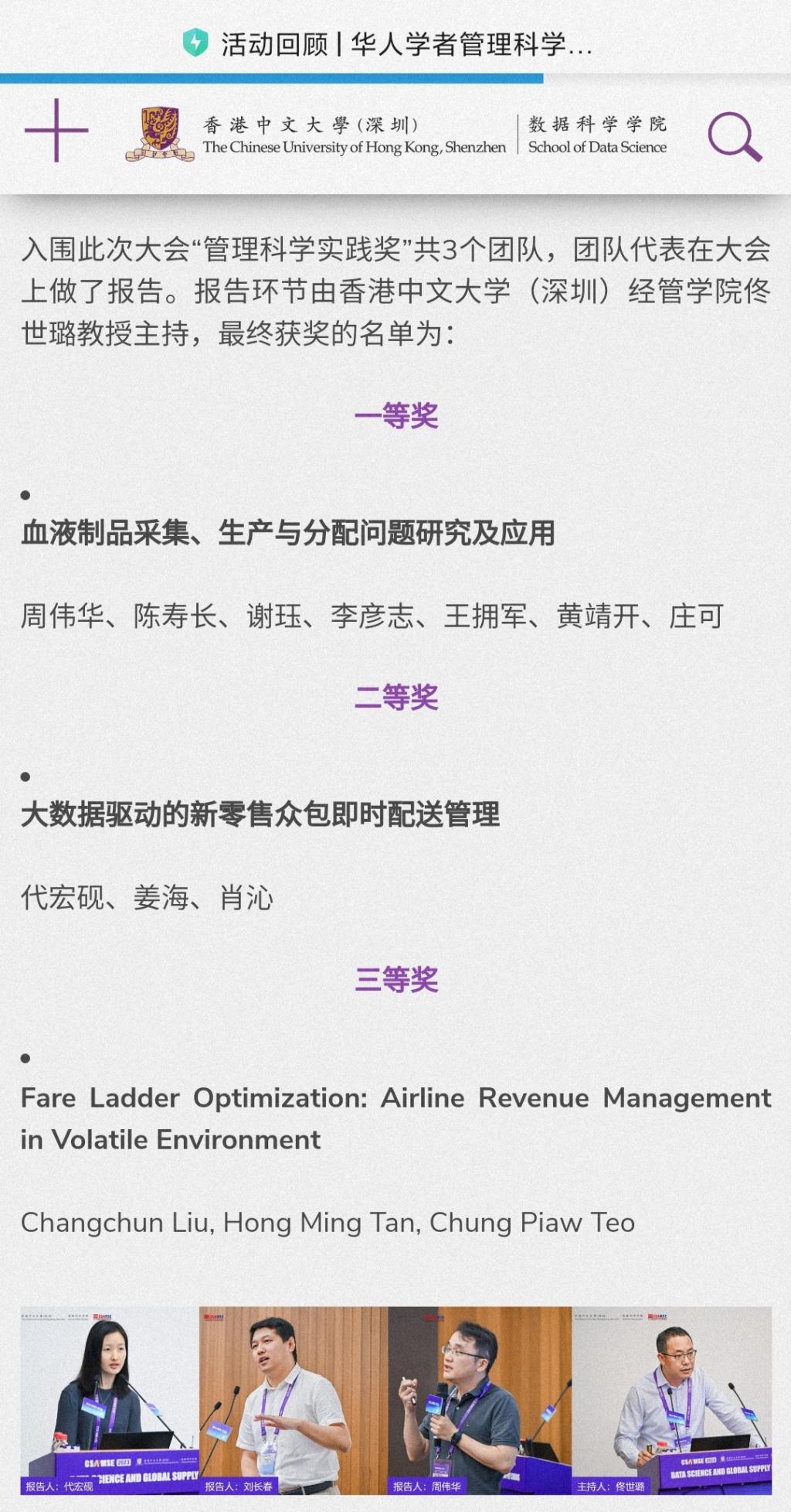 2023年7月29至31日,华人学者管理科学与工程(Chinese Scholars Association for Management Science and Engineering, CSAMSE)第十五届国际年会在深圳召开,beat365官网供应链与运营管理系代宏砚教授团队的项目“大数据驱动的新零售众包即时配送管理”获得“管理科学实践奖”二等奖。