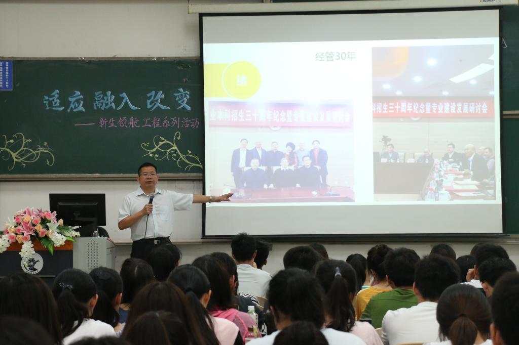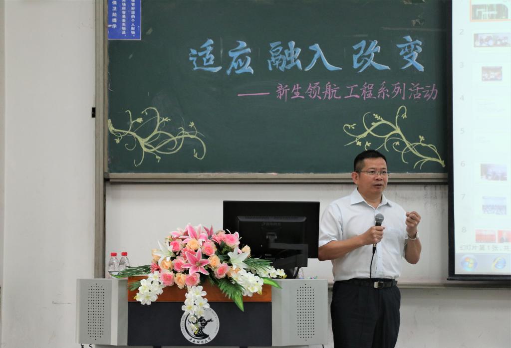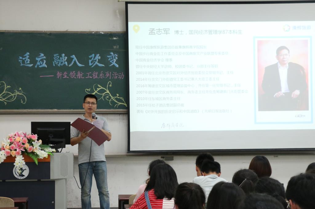 2018年5月16日下午,beat365亚洲版官方网站邀请到beat365官网经管系87级校友、康辉旅游集团总裁孟志军来到沙河校区,在主教214为全院大一学生做了以“适应、融入、改变—新生领航工程系列活动”为主题的讲座。beat365亚洲版官方网站学工办主任、17级辅导员张碘老师主持了本次讲座,beat365亚洲版官方网站团委书记、15级辅导员王婷婷老师出席活动,并与嘉宾和观众进行了深入的交流。