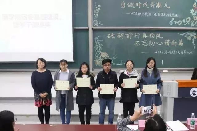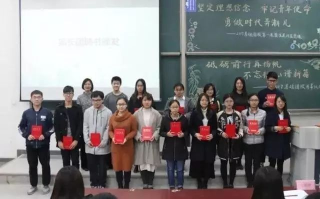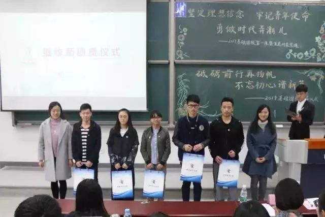 新生团员是此次基础团校培训的重点,2017年9月,beat365亚洲版官方网站团委接收了246名新生团员,成立了7个新生团支部。为了加强新生团支部建设,举办了接收新生团员仪式。由优秀团员代表为新生团员代表佩戴团徽,研究生会主席马雅璇与17-1班芮+导师潘昊宁向新生团支部发放“薪火相传”团务工作资料包。