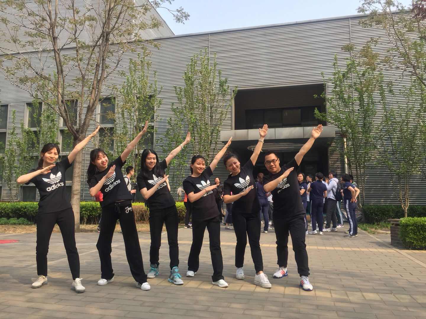 参加广播操比赛的老师们在体育馆前合影