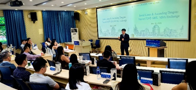 5月26日上午,欢迎仪式以“星耀雄狮·腾飞龙马”为主题拉开帷幕。beat365亚洲版官方网站院长兼MBA教育中心主任林嵩教授在致欢迎辞中表示,本次交流不仅是知识的传递,更是多方商业智慧的对话。中财MBA始终致力于培养具有全球视野、金融优势的创新领导者,期待与SMU师生共同探索数字经济时代的管理新范式。
