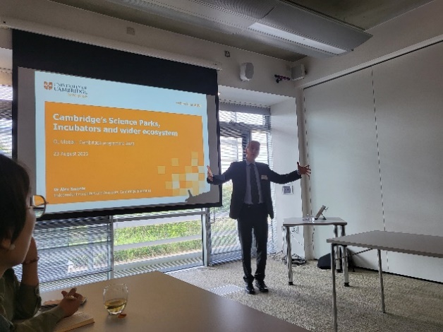 在参访中,剑桥企业中心国际拓展计划研究员、剑桥大学i-Teams创新项目导师布莱恩·科贝特介绍了剑桥企业中心的主营业务、近几年在科技成果转化方面取得的成效,以及围绕剑桥大学所建立起来的商业生态系统与运作模式。剑桥企业中心国际拓展计划研究员、Cambridge Funding Solutions 创始人亚历克斯·史密兹分享了剑桥科技园的运营及其在孵化器和加速器方面的发展历程与新模式。通过本次参访,同学们就中西企业孵化模式差异有了全面、深入的了解认识,自主创业的同学就自身的行业情况与剑桥企业中心的潜在合作机会进行了深入交流,取得了卓有成效的交流成果。