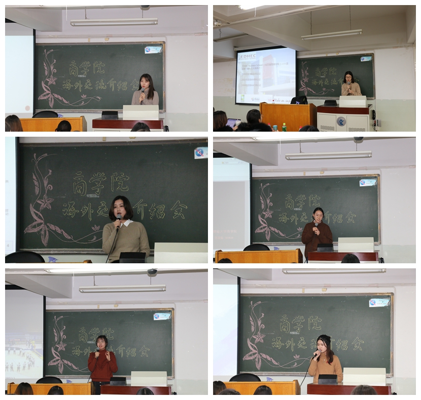 Studentsparticipated in last year’s overseas programs, Wan Zixin (exchange in EDHEC),Yuan Lu (exchange in University of Edinburgh), Li Linzhen (exchange in EDHEC,internship in GfK Verein), Li Tianshu (exchange in UC Berkeley), Fan Xiaomeng(internship in InterGest Worldwide), Huang Wenyi (internship in InterGestWorldwide), shared their exchange experiences, participation in internationalconferences, overseas internships, etc. with the students present. The contentswere detailed and had provided good reference for the 2018 freshman.
