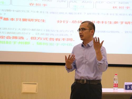 Pandivided his lecture into three parts. First, he decrypted the complicatedrecruitment procedures of banks and analyzed the remuneration structures andlevels of state-owned banks, joint stock commercial banks, and online financialbanks. Next, he shared some useful tips on bank interviews by citing real cases.At the end of his lecture, he elaborated on how to make informed career plans forlong-term development in the banking sector.