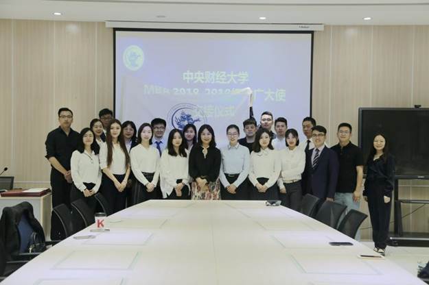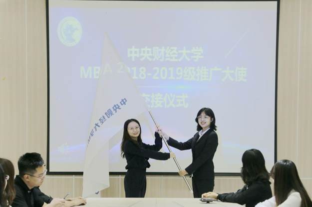 In the fascinating month of May, CentralUniversity of Finance and Economics (CUFE) successfully held the 2018-2019 CUFEMBA Campus Ambassador Handoff Ceremony at Room A02 of the MBA Education Center.Professor Jia Xiaojing, Deputy Director of the CUFE MBA Education Center, andteachers from the Project Development Office, including HuangJixin, Luan Tian and Liu Xinfeng, attended the occasion upon invitation. Headof the 2019 campus ambassador group Wang Yuanyuan presided over the event.