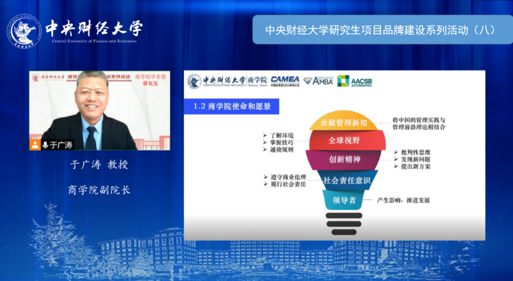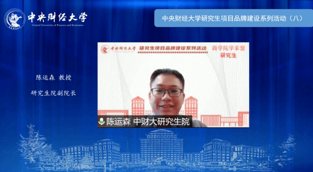 In order to effectively promote the connotative development of graduate education and project brand building at Central University of Finance and Economics, and continuously improve the quality of graduate students, the “Central University of Finance and Economics (CUFE) Graduate Program Brand Building Series (VIII) - The Business School’s Open Class and Enrollment Seminar for Academic Graduate Students” jointly organized by the Graduate School and the Business School was successfully held on the cloud on the afternoon of October 17.
