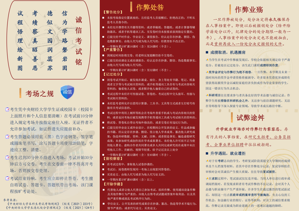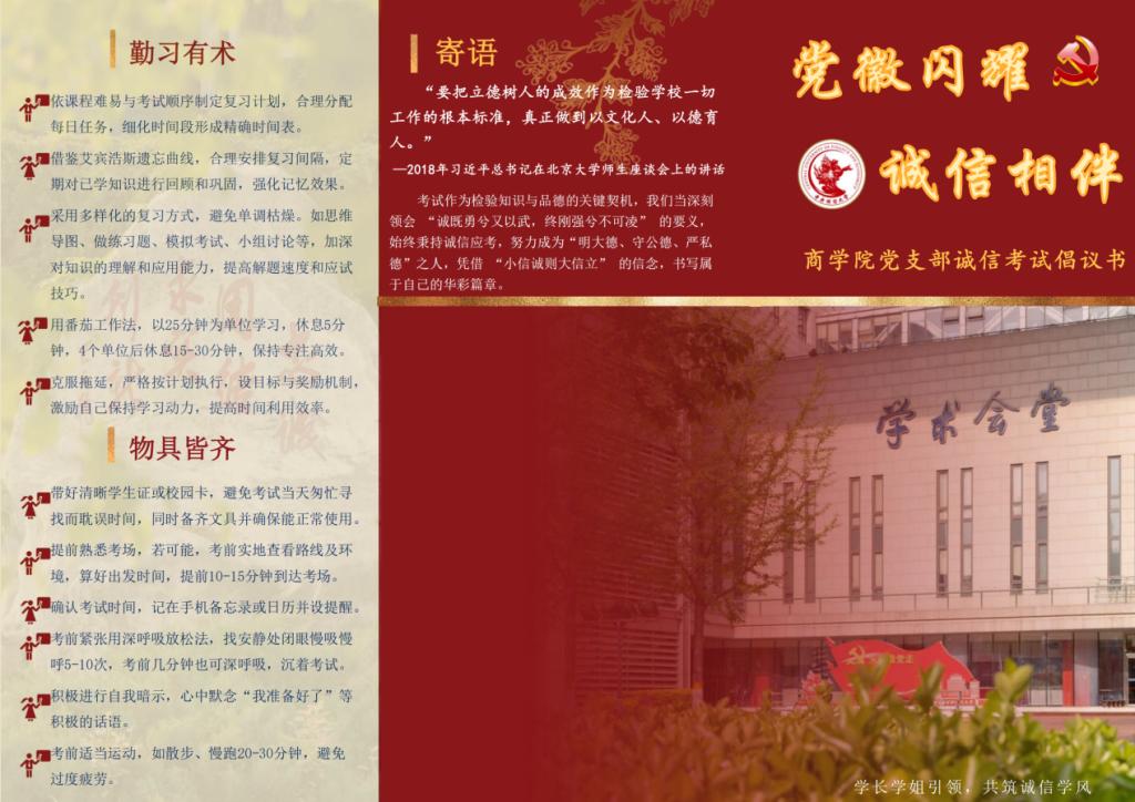 为让大一新生深刻理解学术诚信的重要性,本科生第一党支部精心制作了《beat365亚洲版官方网站党支部诚信考试倡议书》折页。这份折页不仅详细阐述了诚信考试的意义,还介绍了学术不端行为的严重后果,着重强调了考试期间应遵守的基本规范。此外,折页中还包含了相关的学习资源、图书馆服务以及考试前的准备工作提示,帮助新生们高效备考,提升自身的综合素质。