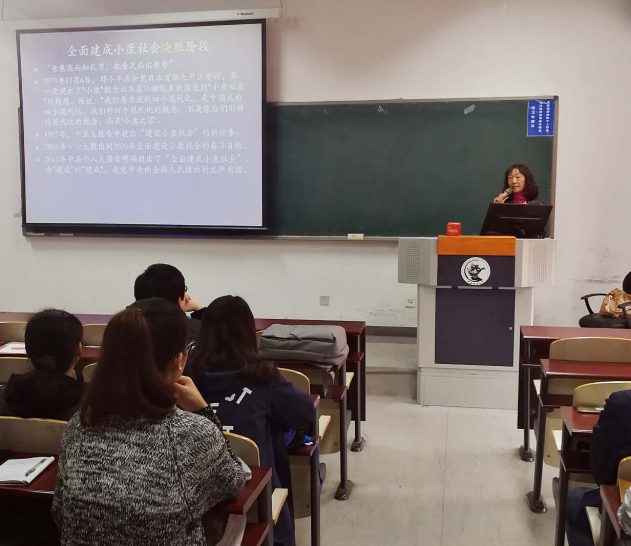 韩兰老师对《决胜全面建成小康社会 夺取新时代中国特色社会主义伟大胜利》的报告做了多方面的解读。韩老师介绍说,这次大会是在全面建成小康社会决胜阶段、中国特色社会主义进入新时代的关键时期召开的具有重要意义的大会。从近代以来的重重磨难到现在中国站起来、富起来、强起来的伟大飞跃,中国特色社会主义在二十一世纪焕发出强大生命力,迎来了实现中华民族伟大复兴的光明前景。中国特色社会主义进入了承前启后,继往开来,全面建成小康社会,实现中华民族伟大复兴的新时代。