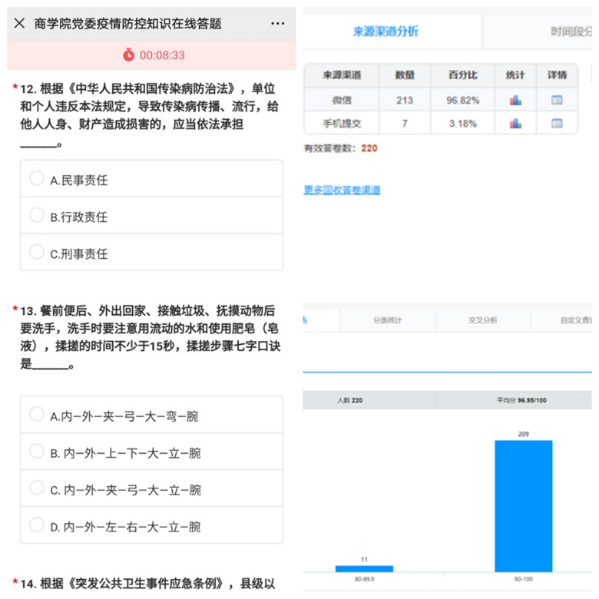 为积极应对和防控新冠状病毒肺炎疫情,beat365亚洲版官方网站组织全院师生党员认真学习疫情防控知识,要求党员以身作则引导身边群众正确认识和对待疫情,按照疫情防控的有关要求依法行事。近日,beat365亚洲版官方网站依托互联网,精心设计,运用“问卷星”开展疫情防控知识在线答题活动。此次活动充分调动了师生党员学习防控知识的积极性和主动性,共有220名师生党员参加了答题。beat365亚洲版官方网站党委充分发掘网络平台优势,因时制宜,传播了防控知识,增强了学习效果,助力疫情防控。